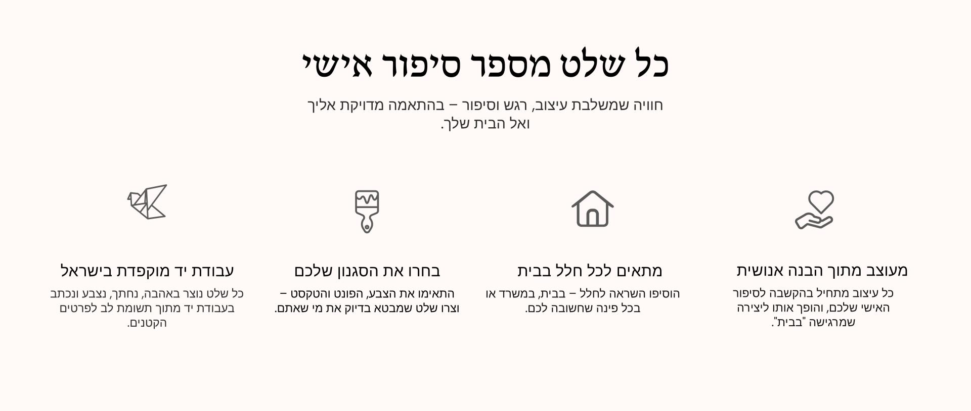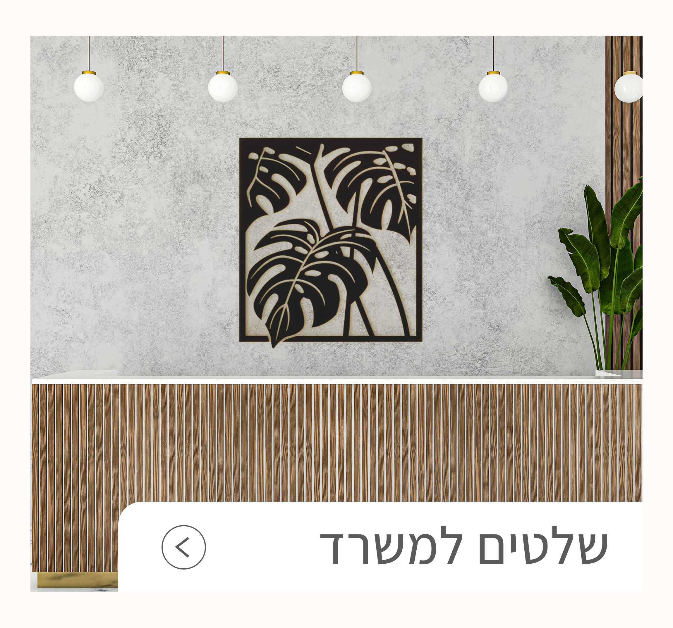 1. בוחרים עיצוב מוכן או מבקשים עיצוב אישי. 2. אני יוצרת סקיצה לפי הבקשה ושולחת לאישור. 3. לאחר אישור – המוצר עובר לחיתוך לייזר, צבע וגימור. 4. בסיום – המוצר נארז ונשלח אליכם